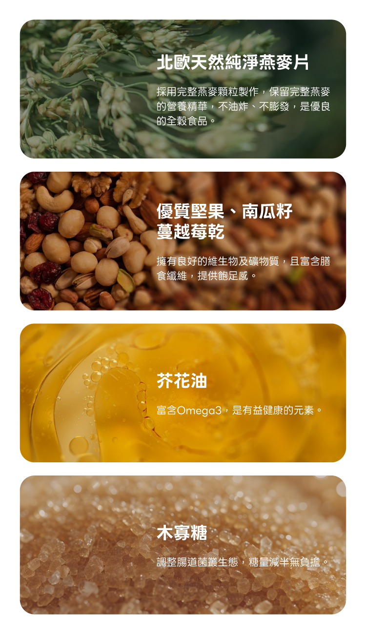 北歐天然純淨燕麥片 : 採用完整燕麥顆粒製造,完整保留燕麥的營養精華