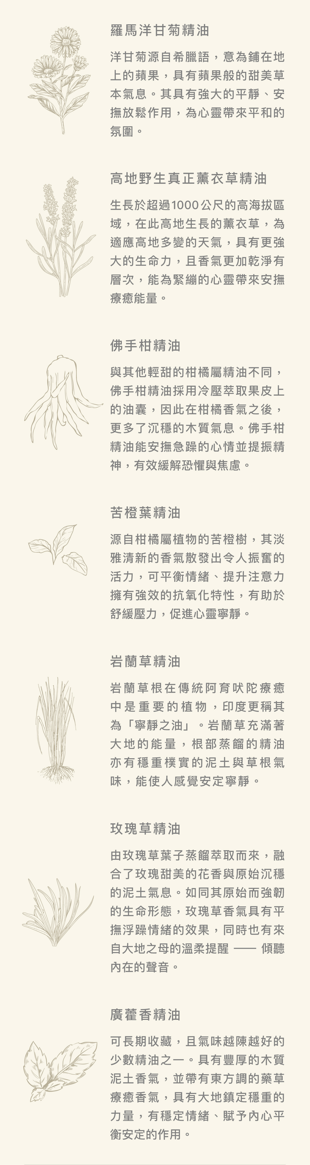 以羅馬洋甘菊與高地真正薰衣草為主題,散發恬淡的香甜青草氣息,以頂級荷荷芭油作為調和基底,質地不油膩,能加速吸收滋養,為緊繃的心緒帶來紓緩療癒效果。