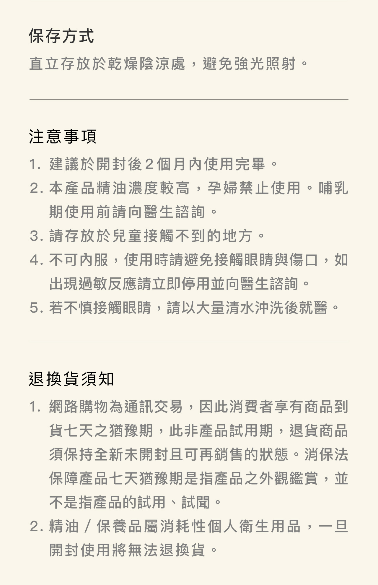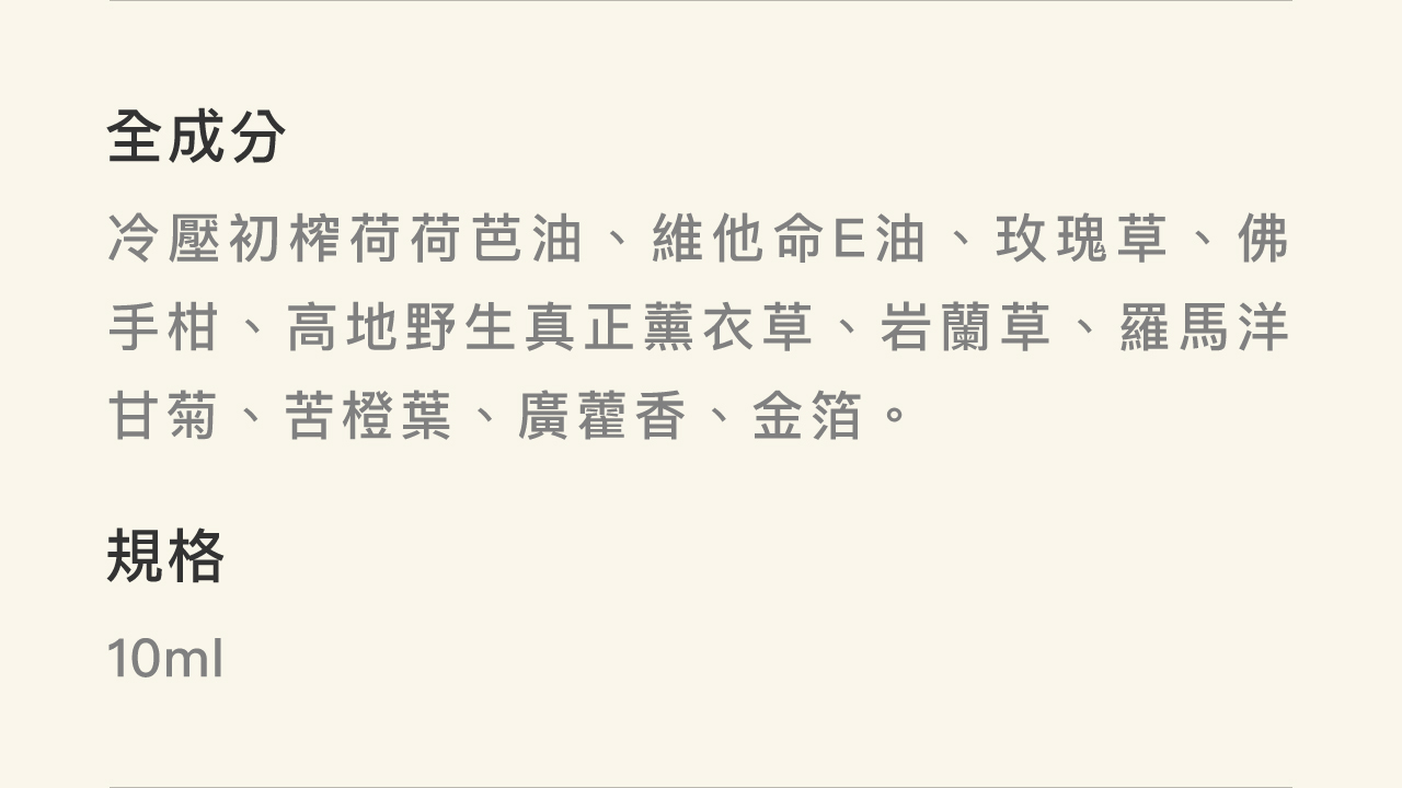 成分:冷壓初榨荷荷芭油、維他命E油、玫瑰草、佛手柑、高地野生真正薰衣草、岩蘭草、羅馬洋甘菊、苦橙葉、廣藿香、金箔。