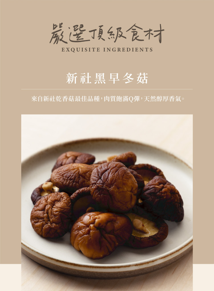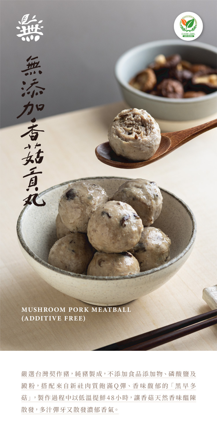 香菇貢丸:搭配來自新社肉質飽滿Q彈、香味馥郁的「黑早冬菇」,放入口中細嚼,散發天然濃郁香氣,安心又美味