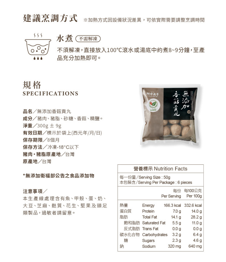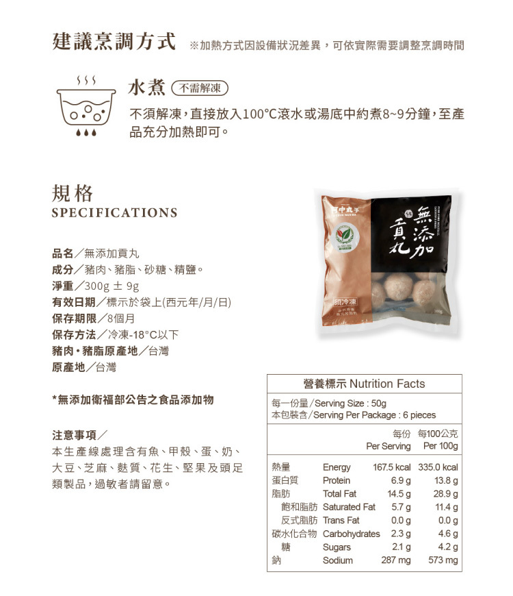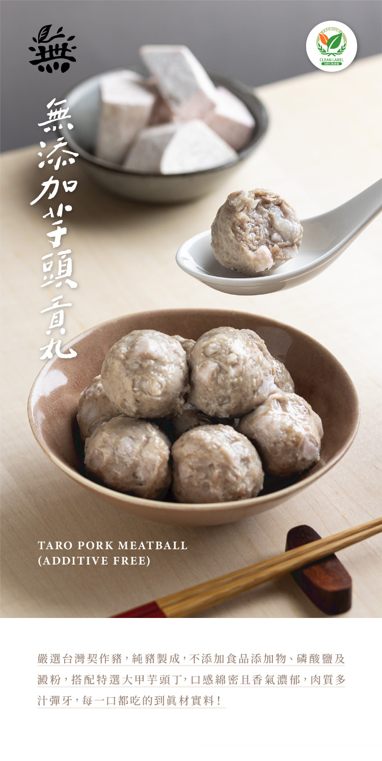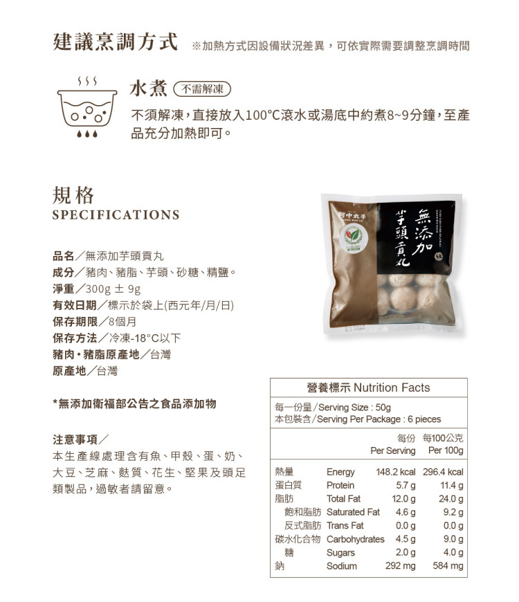內容物:無添加貢丸x4+無添加香菇貢丸x4+無添加芋頭貢丸x4
