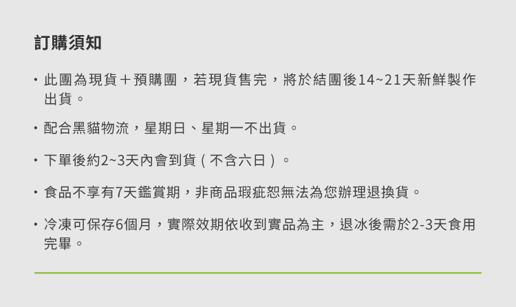 此團為現貨+預購團,若現貨售完,新鮮製作預計於結團後14-21天內出貨