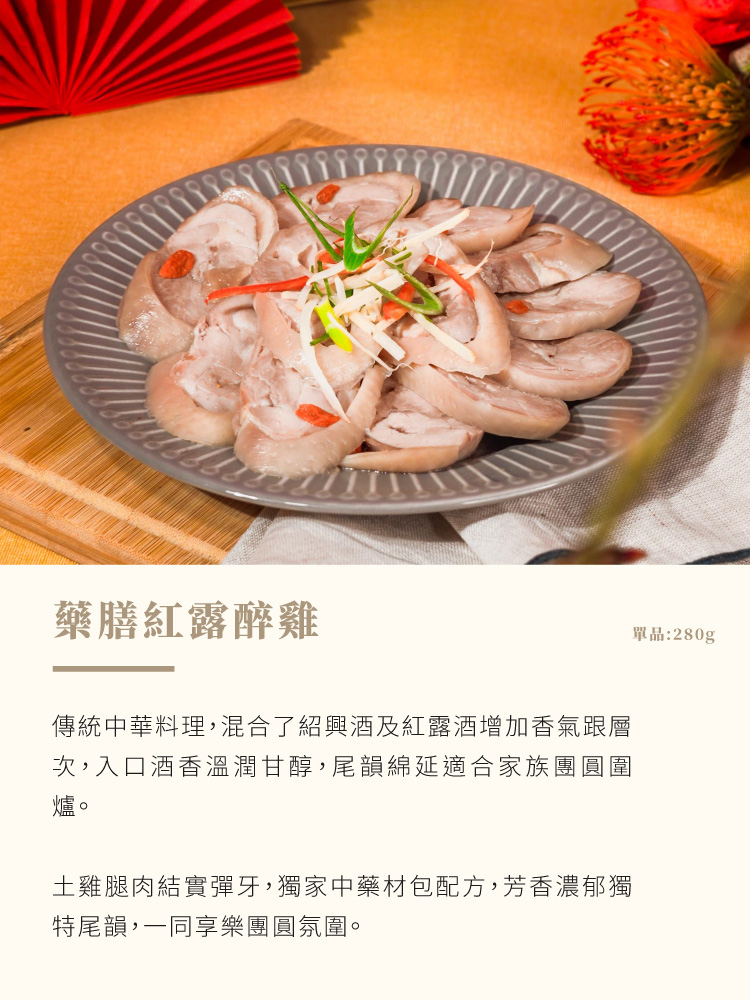 獨享套組內容物:鮑魚干貝荷葉飯x1+藥膳紅露醉雞x1+古早味魷魚螺肉蒜x1+藥膳花生豆干x1