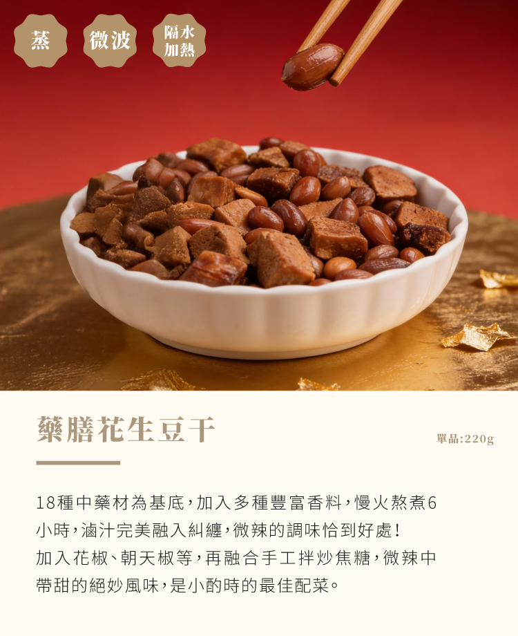 以慢火熬煮6小時,將花生與豆干燉煮入味吸飽18種中藥材氣味,