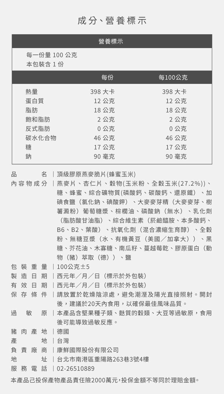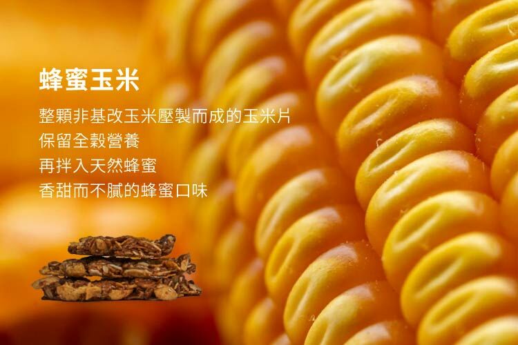 蜂蜜玉米脆片:整顆非基改玉米壓製,保留膳食纖維與全穀營養