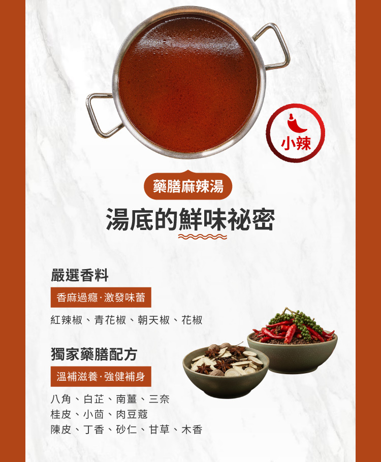 漢方藥膳配方,結合多種中藥材與香辛料,讓湯頭層次多元,