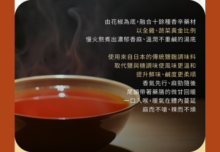 麻而不上火、溫潤順口不燒喉,即使不敢吃辣也可以放心嘗試