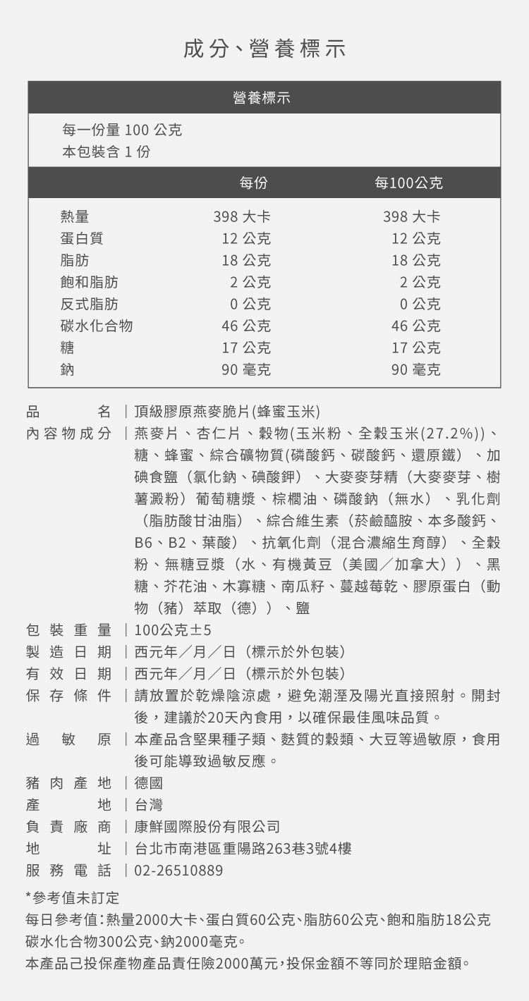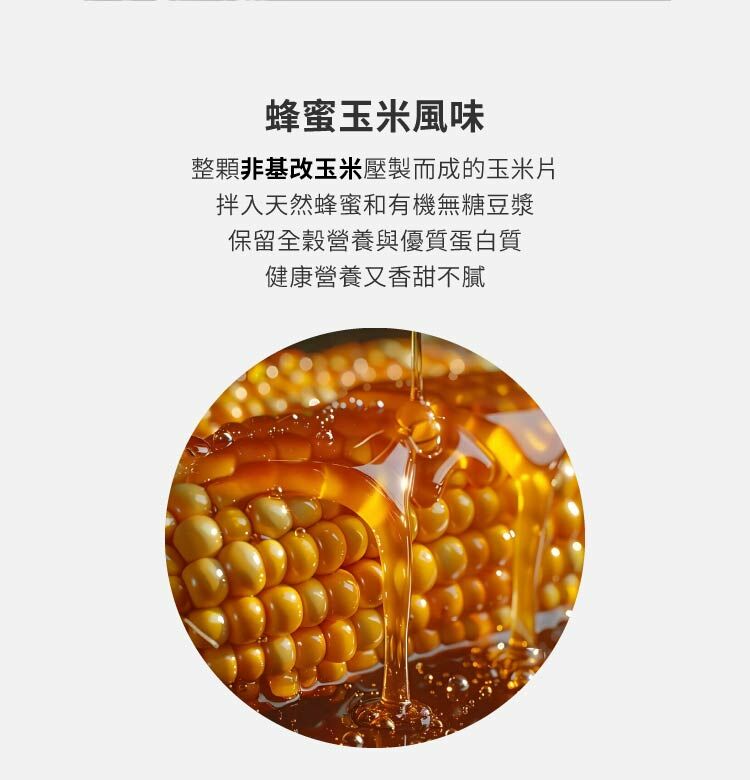蜂蜜玉米脆片:整顆非基改玉米壓製,保留膳食纖維與全穀營養