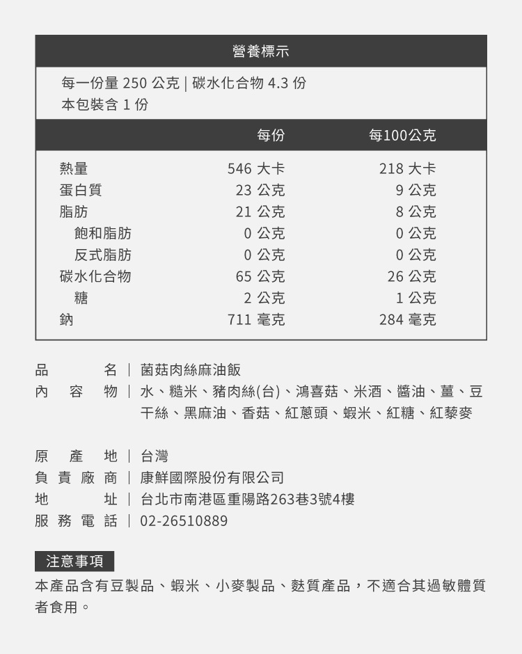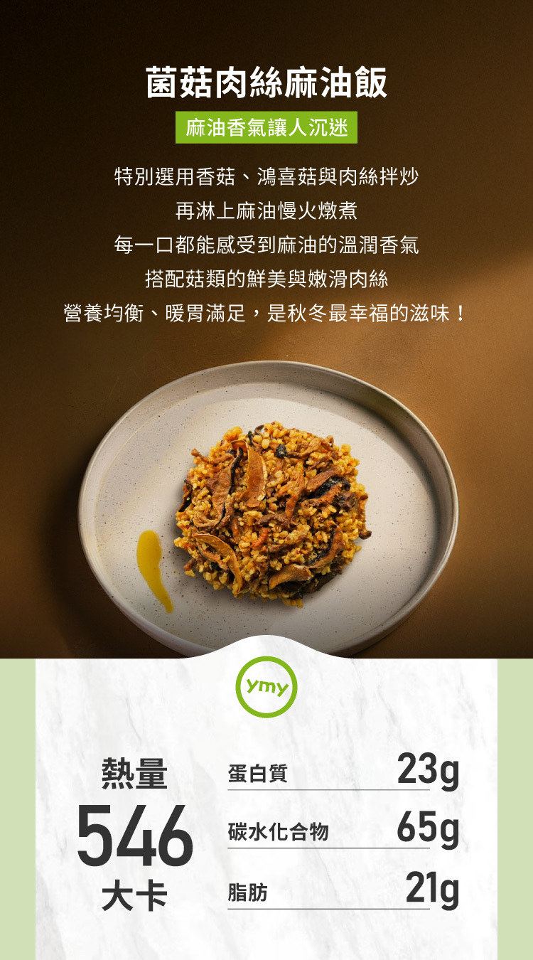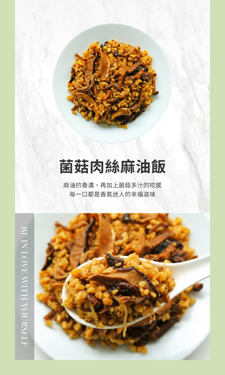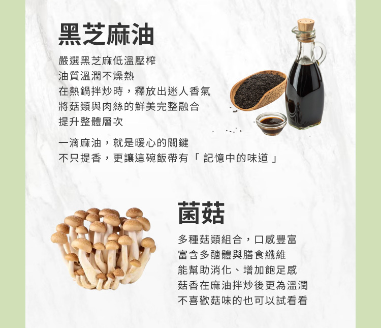 特別選用香菇、鴻喜菇與肉絲拌炒,再淋上麻油慢火燉煮